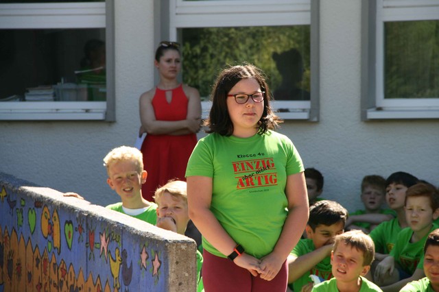 Hierzu trafen sich die Kinder der Grundschule, ihre Lehrer und die Eltern der Viertklässler auf dem Schulhof. Das Programm begann mit einer kurzen Begrüßung. Es folgten selbst getextete Gedichte der Kinder, der Stuhlrap der 4a und das Lied „Alte Schule“ der 4b.